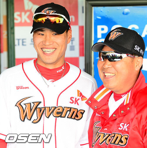 7일 오후 인천 문학구장에서 열린 2013 한국야쿠르트 세븐프로야구 SK 와이번스와 두산 베어스의 경기 전 SK 유니폼을 입은 김상현이 이만수 감독과 환하게 웃고 있다.