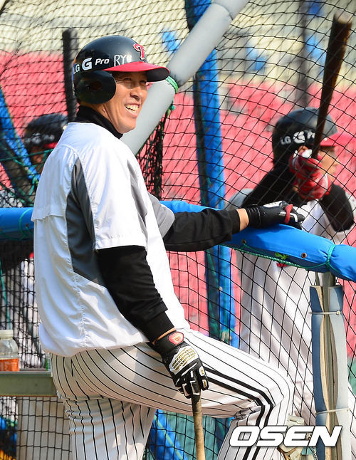 7일 오후 서울 잠실구장에서 열리는 '2013 한국야쿠르트 세븐 프로야구' LG 트윈스와 넥센 히어로즈의 경기 시작 전 이병규가 동료들과 이야기를 나누며 미소를 짓고 있다.