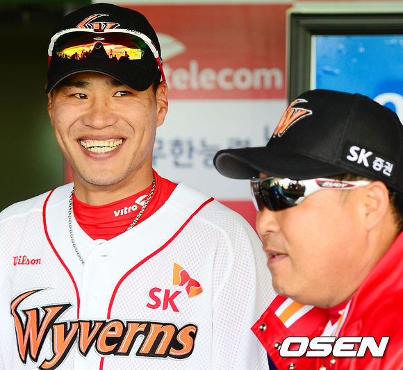 7일 오후 인천 문학구장에서 열린 2013 한국야쿠르트 세븐프로야구 SK 와이번스와 두산 베어스의 경기 전 SK 유니폼을 입은 김상현이 이만수 감독과 얘기를 나누고 있다.