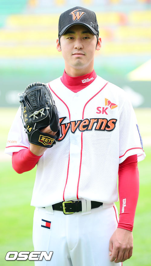 7일 오후 인천 문학구장에서 열린 2013 한국야쿠르트 세븐프로야구 SK 와이번스와 두산 베어스의 경기 전 SK 유니폼을 입은 진해수가 포즈를 취하고 있다.