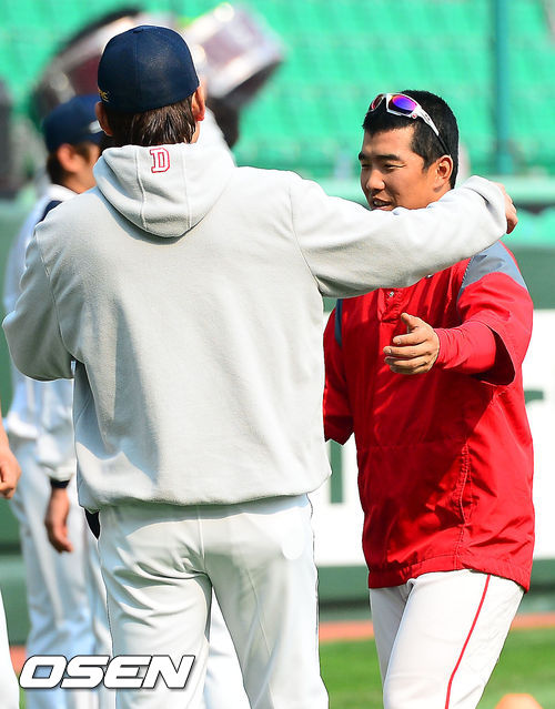 7일 오후 인천 문학구장에서 열린 2013 한국야쿠르트 세븐프로야구 SK 와이번스와 두산 베어스의 경기 전 SK 정근우와 두산 김선우가 포옹을 하고 있다.