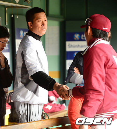 7일 오후 서울 잠실구장에서 열리는 '2013 한국야쿠르트 세븐 프로야구' LG 트윈스와 넥센 히어로즈의 경기 시작 전 이병규와 염경엽 감독이 인사를 나누고 있다.