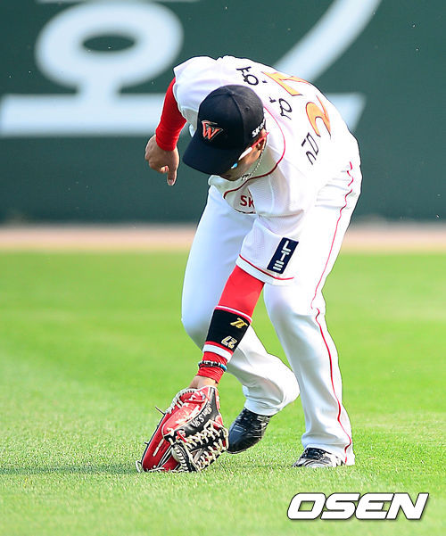 7일 오후 인천 문학구장에서 열린 2013 한국야쿠르트 세븐프로야구 SK 와이번스와 두산 베어스의 경기 전 SK 유니폼을 입은 김상현이 수비 훈련을 하고 있다.