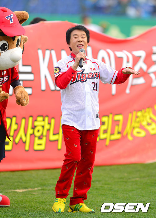 7일 오후 광주 무등구장에서 열리는 '2013 한국야쿠르트 세븐 프로야구' KIA 타이거즈와 롯데 자이언츠의 경기에 앞서 가수 송대관이 멋진 무대를 펼치고 있다