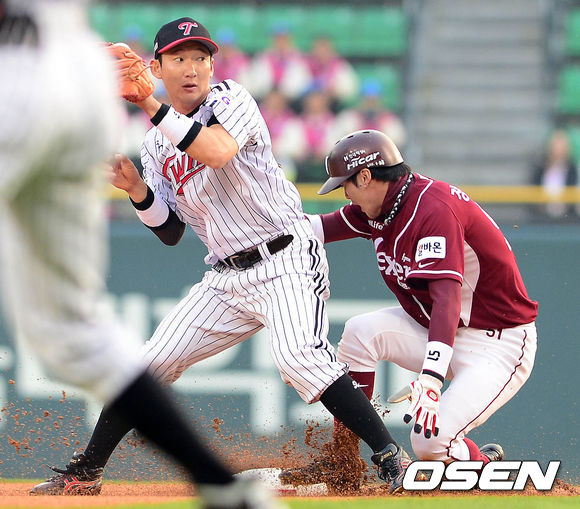 7일 오후 서울 잠실구장에서 열린 '2013 한국야쿠르트 세븐 프로야구' LG 트윈스와 넥센 히어로즈의 경기 1회초 1사 1루 이택근의 3루수 앞 땅볼 상황, 2루에서 장기영이 세이프되고 있다.