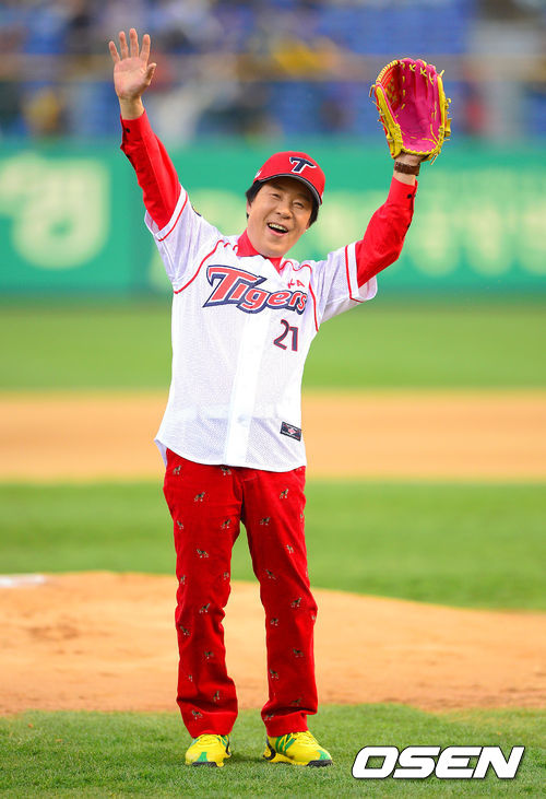 7일 오후 광주 무등구장에서 열린 '2013 한국야쿠르트 세븐 프로야구' KIA 타이거즈와 롯데 자이언츠의 경기, 가수 송대관이 시구를 마친후 팬들에게 인사를 하고 있다