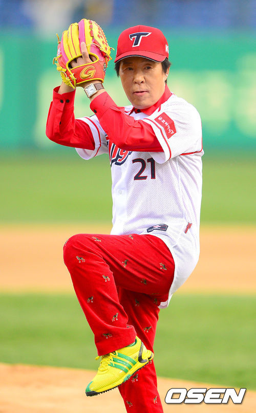 7일 오후 광주 무등구장에서 열린 '2013 한국야쿠르트 세븐 프로야구' KIA 타이거즈와 롯데 자이언츠의 경기, 가수 송대관이 시구를 하고 있다.