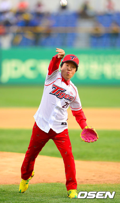 7일 오후 광주 무등구장에서 열린 '2013 한국야쿠르트 세븐 프로야구' KIA 타이거즈와 롯데 자이언츠의 경기, 가수 송대관이 시구를 하고 있다.