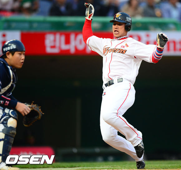 7일 오후 인천 문학구장에서 열린 2013 한국야쿠르트 세븐프로야구 SK 와이번스와 두산 베어스의 경기, 1회말 2사 주자 만루 SK 조인성의 우익수 앞 2타점 적시타때 2루 주자 김상현이 3루를 돌아 홈으로 몸을 던지고 있다.