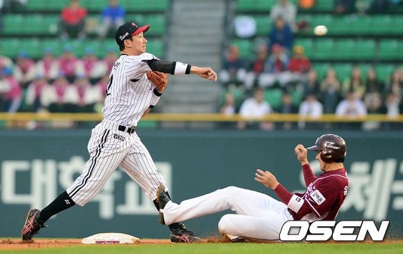 7일 오후 서울 잠실구장에서 열린 '2013 한국야쿠르트 세븐 프로야구' LG 트윈스와 넥센 히어로즈의 경기 2회초 무사 1,3루 김민성의 병살타를 손주인이 2루에서 포스아웃 시킨 후 1루로 송구하고 있다.