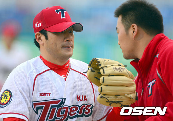 7일 오후 광주 무등구장에서 열린 '2013 한국야쿠르트 세븐 프로야구' KIA 타이거즈와 롯데 자이언츠의 경기, 1회초 이닝종료 후 서재응이 김진우의 격려를 받으며 더그아웃으로 들어가고 있다