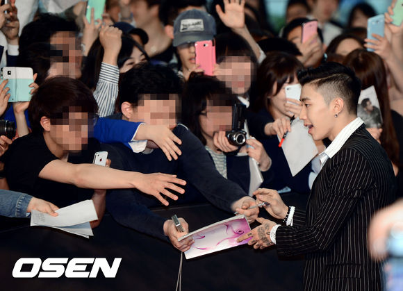 7일 오후 서울 영등포 타임스퀘어에서 진행된 영화 '애프터 어스' 레드카펫 행사에서 박재범이 팬들에게 사인을 해주고 있다.