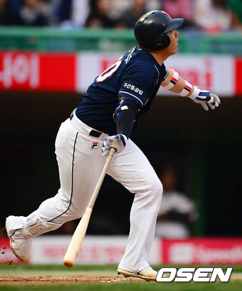 7일 오후 인천 문학구장에서 열린 2013 한국야쿠르트 세븐프로야구 SK 와이번스와 두산 베어스의 경기, 1회초 2사 주자 2루 두산 김현수가 중견수 앞 선취 1타점 적시타를 날리고 있다.