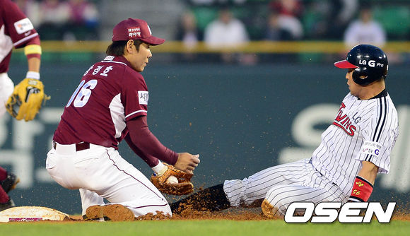7일 오후 서울 잠실구장에서 열린 '2013 한국야쿠르트 세븐 프로야구' LG 트윈스와 넥센 히어로즈의 경기 3회말 1사 1루 오지환이 헛스윙 삼진을 당한 가운데, 1루주자 최경철이 도루를 시도, 2루에서 아웃되고 있다.