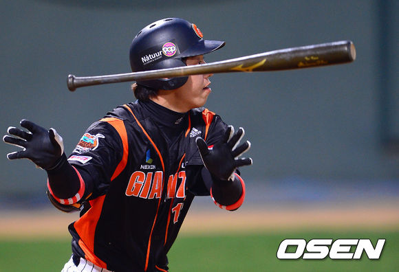 7일 오후 광주 무등구장에서 열린 '2013 한국야쿠르트 세븐 프로야구' KIA 타이거즈와 롯데 자이언츠의 경기, 4회초 1사 1,2루 롯데 김대우가 선취 2타점 적시타를 날리고 있다