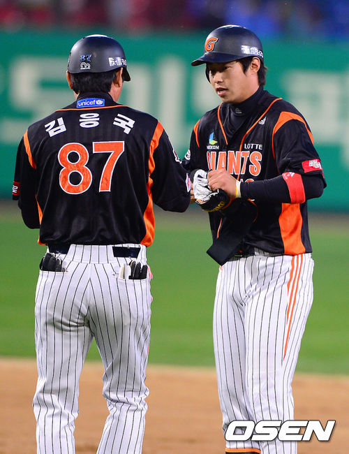7일 오후 광주 무등구장에서 열린 '2013 한국야쿠르트 세븐 프로야구' KIA 타이거즈와 롯데 자이언츠의 경기, 4회초 1사 1,2루 롯데 김대우가 선취 2타점 적시타를 날리고 김응국 코치와 하이파이브를 하고 있다