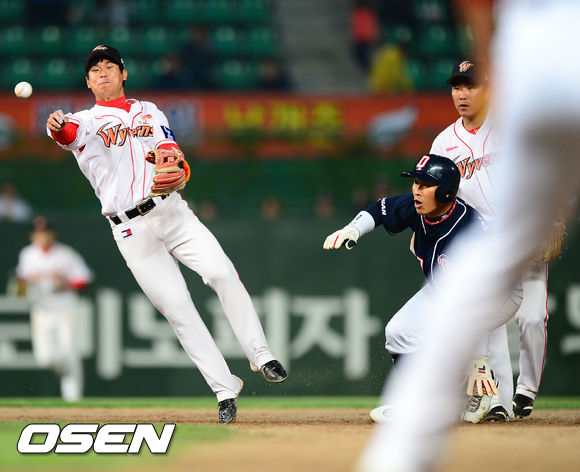 7일 오후 인천 문학구장에서 열린 2013 한국야쿠르트 세븐프로야구 SK 와이번스와 두산 베어스의 경기, 4회초 1사 주자 1루 두산 허경민의 2루수 병살타때 SK 유격수 최윤석이 1루로 송구하고 있다.