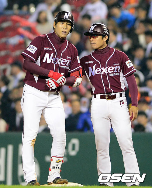 7일 오후 서울 잠실구장에서 열린 '2013 한국야쿠르트 세븐 프로야구' LG 트윈스와 넥센 히어로즈의 경기 5회초 2사 1,2루 강정호가 1타점 적시타를 치고 1루베이스에 서 있다.