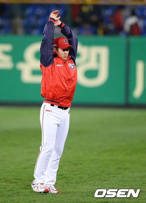 7일 오후 광주 무등구장에서 열린 '2013 한국야쿠르트 세븐 프로야구' KIA 타이거즈와 롯데 자이언츠의 경기, 클리닝타임때 KIA 송은범이 몸을 풀고 있다