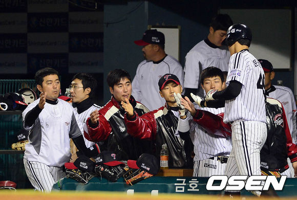 7일 오후 서울 잠실구장에서 열린 '2013 한국야쿠르트 세븐 프로야구' LG 트윈스와 넥센 히어로즈의 경기 5회말 1사 2,3루 정주현의 2루수 앞 땅볼에 홈을 밟은 3루주자 문선재가 덕아웃에서 동료들과 하이파이브를 하고 있다.