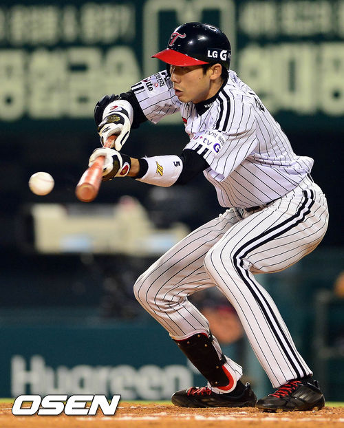 7일 오후 서울 잠실구장에서 열린 '2013 한국야쿠르트 세븐 프로야구' LG 트윈스와 넥센 히어로즈의 경기 6회말 무사 1루 김용의가 희생번트를 치고 있다.