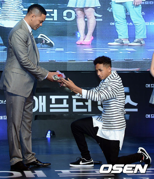 7일 오후 서울 영등포 타임스퀘어에서 진행된 영화 '애프터 어스' 레드카펫 행사에서 제이든 스미스가 아버지인 윌 스미스에게 어버이날 기념행사로 카네이션을건네고 있다.