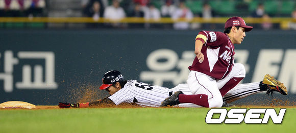 7일 오후 서울 잠실구장에서 열린 '2013 한국야쿠르트 세븐 프로야구' LG 트윈스와 넥센 히어로즈의 경기 6회말 2사 1루 정의윤의 타석, 이대형이 도루에 성공하고 있다.