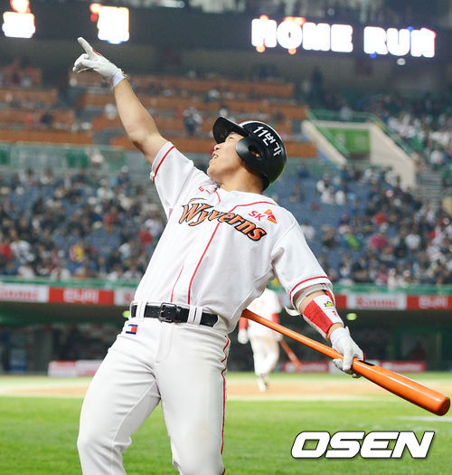 7일 오후 인천 문학구장에서 열린 2013 한국야쿠르트 세븐프로야구 SK 와이번스와 두산 베어스의 경기,5회말 2사 주자 1루 SK 정근우가 좌중월 투런 홈런을 날린 후 덕아웃에서 팬들에게 인형을 던지고 있다.