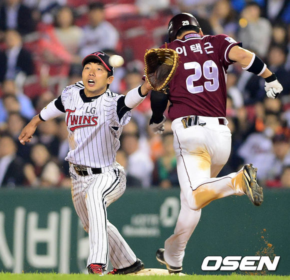 7일 오후 서울 잠실구장에서 열린 '2013 한국야쿠르트 세븐 프로야구' LG 트윈스와 넥센 히어로즈의 경기 7회초 1사 이택근이 3루수 앞 땅볼을 친 후 1루에서 아웃당하고 있다.