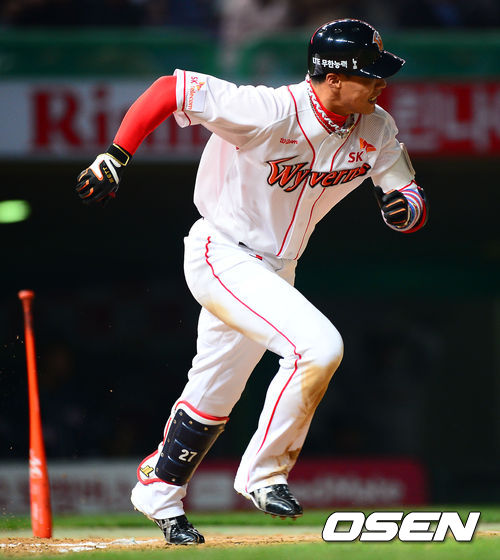 7일 오후 인천 문학구장에서 열린 2013 한국야쿠르트 세븐프로야구 SK 와이번스와 두산 베어스의 경기,6회말 SK 선두타자 김상현이 유격수 왼쪽 내야 안타를 날리고 있다.