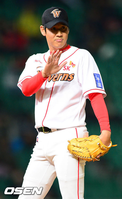 7일 오후 인천 문학구장에서 열린 2013 한국야쿠르트 세븐프로야구 SK 와이번스와 두산 베어스의 경기, 7회초 SK 선발 김광현 대신 마운드에 오른 윤길현이 두산 선두타자 손시헌의 몸에 볼을 맞추고 손시헌에게 미안하다는 사인을 보내고 있다.