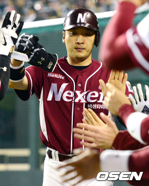 7일 오후 서울 잠실구장에서 열린 '2013 한국야쿠르트 세븐 프로야구' LG 트윈스와 넥센 히어로즈의 경기 9회초 1사 만루 이성열의 희생플라이에 홈을 밟은 3루주자 이택근이 덕아웃에서 동료들과 하이파이브를 하고 있다.