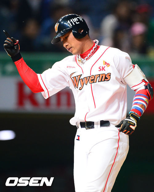 7일 오후 인천 문학구장에서 열린 2013 한국야쿠르트 세븐프로야구 SK 와이번스와 두산 베어스의 경기, 8회말 무사 주자 1루 SK 김상현이 투런포를 날린 후 홈에서 세리머니를 하고 있다.