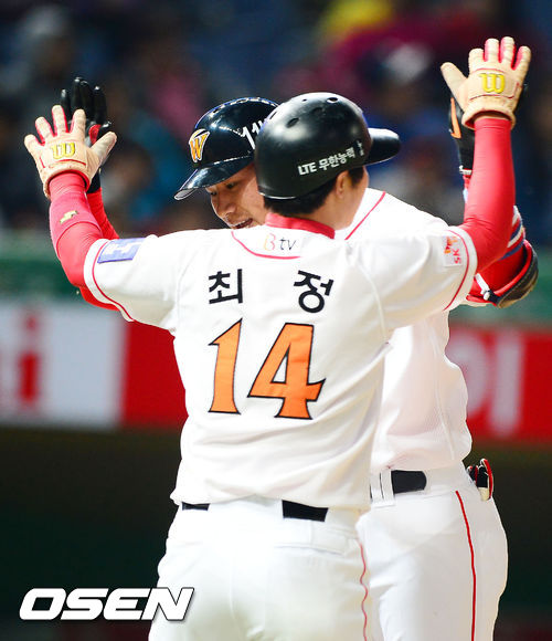 7일 오후 인천 문학구장에서 열린 2013 한국야쿠르트 세븐프로야구 SK 와이번스와 두산 베어스의 경기, 8회말 무사 주자 1루 SK 김상현이 투런포를 날린 후 홈에서 선행주자 최정과 하이파이브를 하고 있다.