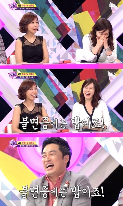 이날 개그우먼 정선희는 "최화정씨가 한번은 불면증 때문에 고생을 많이 하셨다"라면서 "그런데 어느날 얼굴이 정말 좋아보이더라. 그래서 '불면증 고쳤어?' 물었더니 '고쳤다'고 대답하더라"고 말했다.