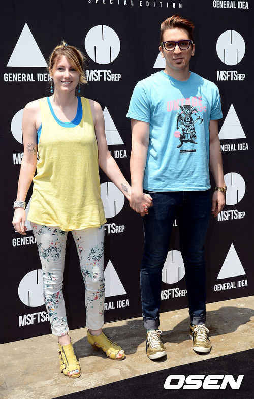 8일 오후 서울 강남구 신사동 GENERAL IDEA 압구정 플래그샵에서 진행된 '디자이너 최범석 제너럴 아이디어& 제이든 스미스 MSFTSrep 콜라보레이션' 행사에서 버스커버스커 브래드가 배우자 대니와 포토타임을 갖고 있다.