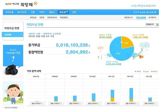 지난 2007년 12월 기부금을 모으기 시작한 ‘희망해(http://hope.daum.net/)’는 각종 사회단체가 주도한 기존의 모금 캠페인과 달리 모금 제안부터 진행, 참여까지 모금의 전 과정을 누리꾼이 만들어가는 것이 특징이다. 특히 누리꾼들이 PC는 물론 모바일에서도 기부에 참여할 수 있도록 접근성을 높이고, 손쉬운 기부 방법을 지속적으로 도입하는 등 온라인을 통한 나눔과 기부 문화 활성화에 앞장서왔다.