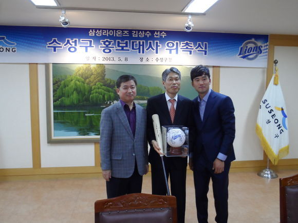 김상수는 8일 오전 11시 30분 대구 수성구청 2층 회의실에서 이진훈 수성구청장으로부터 홍보대사 위촉패를 받았다. 삼성 송삼봉 단장과 박덕주 마케팅팀 부장, 수성구청 관계자, 김상수의 팬클럽 회원 등 20여명이 이날 행사를 지켜봤다.