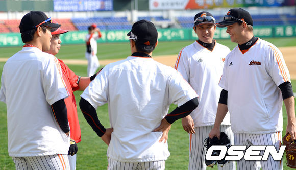 8일 오후 광주 무등구장에서 열리는 '2013 한국야쿠르트 세븐 프로야구' KIA 타이거즈와 롯데 자이언츠의 경기에 앞서 KIA 나지완이 롯데 옥스프링과 이야기를 나누고 있다.