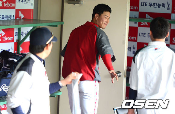 8일 오후 인천 문학구장에서 열리는 2013 한국야쿠르트 세븐프로야구 SK 와이번스와 두산 베어스의 경기에 앞서 SK 김상현이 두산 더그아웃을 찾아 선수들과 인사를 나누고 있다.