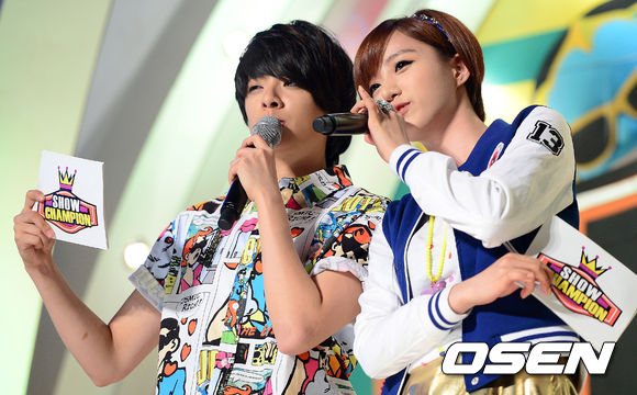 8일 오후 서울 광장동 유니클로 악스에서 진행된 MBC MUSIC '쇼! 챔피언'에서 에프엑스 엠버와 티아라 은정이 진행을 하고 있다.
