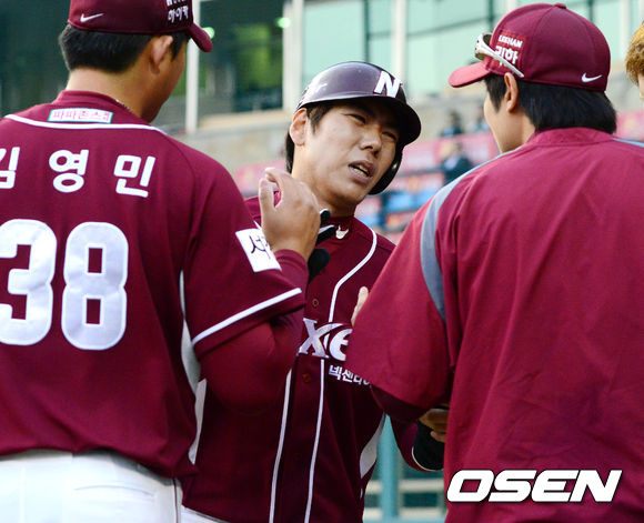 8일 오후 서울 잠실구장에서 열린 '2013 한국야쿠르트 세븐 프로야구' LG 트윈스와 넥센 히어로즈의 경기 2회초 2사 1,2루 서동욱의 2타점 3루타에 홈을 밟은 1루주자 강정호가 덕아웃에서 동료들과 하이파이브를 하고 있다.