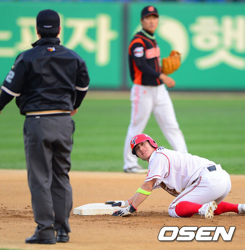8일 오후 광주 무등구장에서 열린 '2013 한국야쿠르트 세븐 프로야구' KIA 타이거즈와 롯데 자이언츠의 경기, 1회말 1사 1루 KIA 이범호의 타석때 롯데 정훈 2루수가 1루 주자 김선빈의 도루를 저지시켰다. 김선빈이 아쉬운 표정으로 박근영 2루심을 바라보고 있다.
