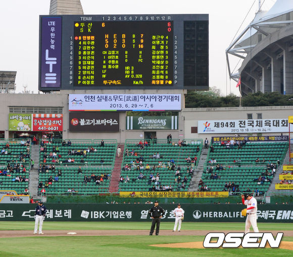 8일 오후 인천 문학구장에서 열린 2013 한국야쿠르트 세븐프로야구 SK 와이번스와 두산 베어스의 경기, 1회초 두산이 아웃카운트없이 타자일순하며 6득점을 뽑아내고 있다.
