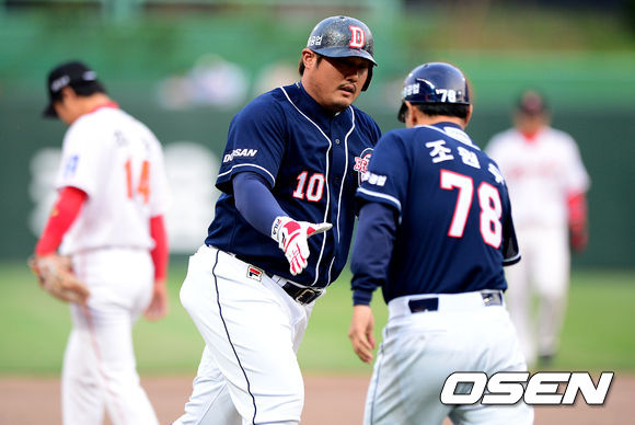 8일 오후 인천 문학구장에서 열린 2013 한국야쿠르트 세븐프로야구 SK 와이번스와 두산 베어스의 경기, 1회초 무사 2,3루에서 두산 최준석이 스리런포를 날리고 조원우 코치와 하이파이브를 하며 그라운드를 돌고 있다.