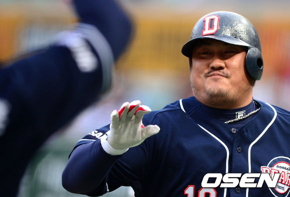 8일 오후 인천 문학구장에서 열린 2013 한국야쿠르트 세븐프로야구 SK 와이번스와 두산 베어스의 경기, 1회초 무사 1,3루에서 두산 최준석이 스리런포를 날리고 홈을 밟으며 동료선수와 하이파이브를 하고 있다.