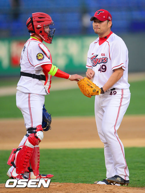 8일 오후 광주 무등구장에서 열린 '2013 한국야쿠르트 세븐 프로야구' KIA 타이거즈와 롯데 자이언츠의 경기, 2회초 2실점 허용한 KIA 선발투수 김진우가 차일목 포수와 이야기를 나누고 있다