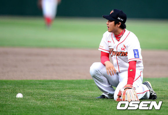 8일 오후 인천 문학구장에서 열린 2013 한국야쿠르트 세븐프로야구 SK 와이번스와 두산 베어스의 경기, 1회초 무사 만루에서 SK 최정이 두산 손시헌의 3루수 땅볼 타구를 놓치며 아쉬워하고 있다.