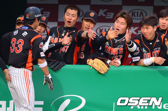 8일 오후 광주 무등구장에서 열린 '2013 한국야쿠르트 세븐 프로야구' KIA 타이거즈와 롯데 자이언츠의 경기, 2회초 2사 2루 롯데 김문호의 1타점 적시타때 득점을 올린 2루 주자 정훈이 동료들의 환영을 받고 있다. 정훈은 전 타석에서 선취 1타점 적시타를 날렸다.