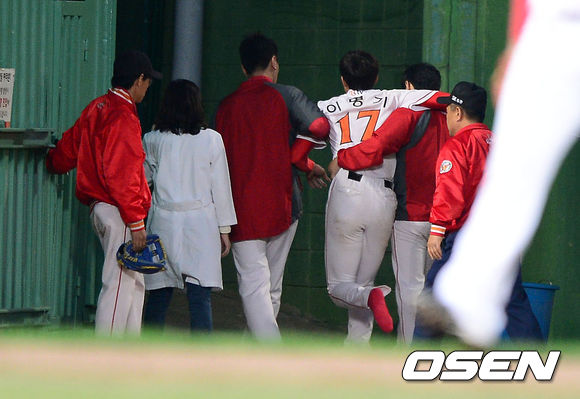 8일 오후 인천 문학구장에서 열린 2013 한국야쿠르트 세븐프로야구 SK 와이번스와 두산 베어스의 경기, 3회초 2사 1,2루에서 SK 이명기가 두산 홍성흔의 타구를 잡으려다 발을 잘못 디뎌서 왼쪽 발목 부상을 당하고 치료받기위해 경기장을 나서고 있다.